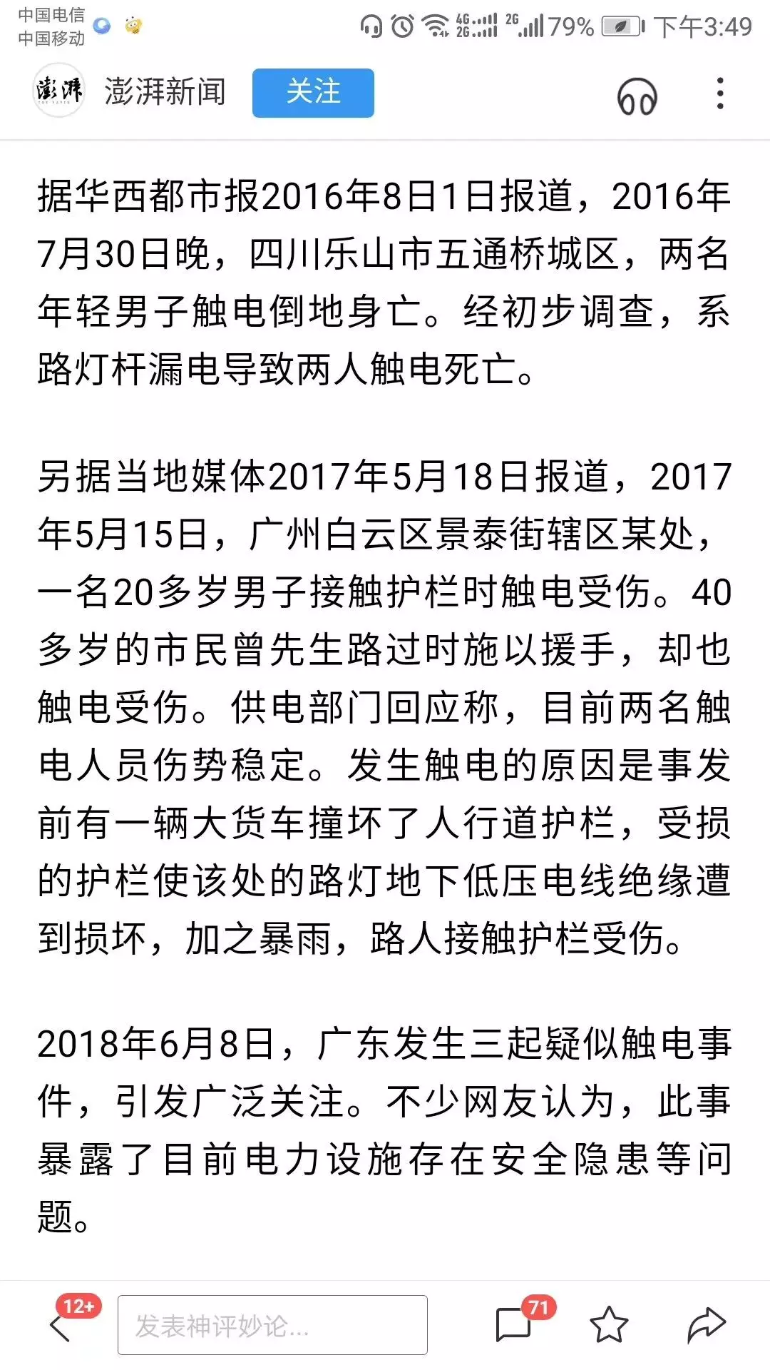 廣東一天三起疑觸電身亡事件,市電路燈安全隱患值得思考