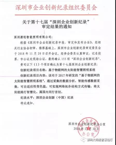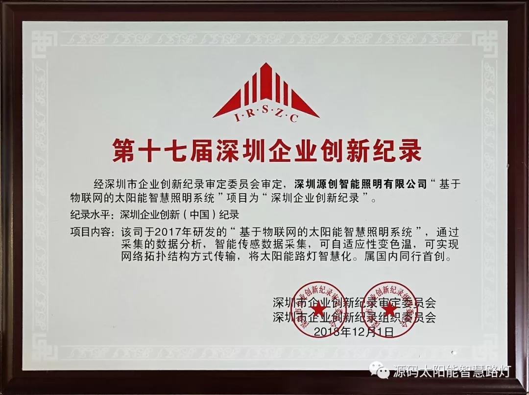 其中深圳源創(chuàng)智能照明有限公司(以下簡稱“源碼太陽能路燈”),憑借在太陽能路燈創(chuàng)新技術的突出優(yōu)勢獲得“深圳企業(yè)創(chuàng)新(中國)紀錄”獎。該記錄將物聯(lián)網(wǎng)技術運用于太陽能路燈,有效地解決路燈的管理、維護問題,賦予太陽能路燈”智慧“屬性,在行業(yè)內屬領先水平,屬國內同行首創(chuàng)。