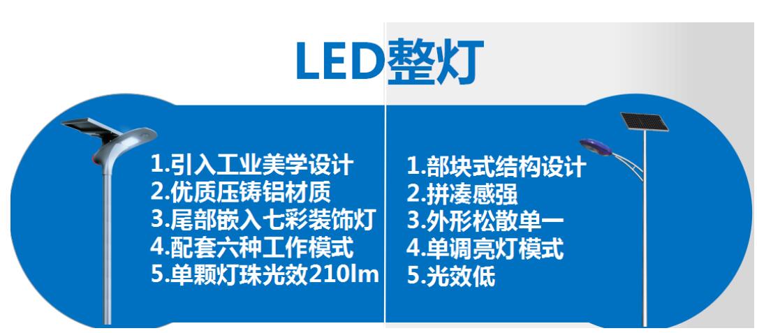 太陽能路燈在核心部件、LED整燈、電池、外部結構、太陽能板等和傳統路燈有明顯區別。