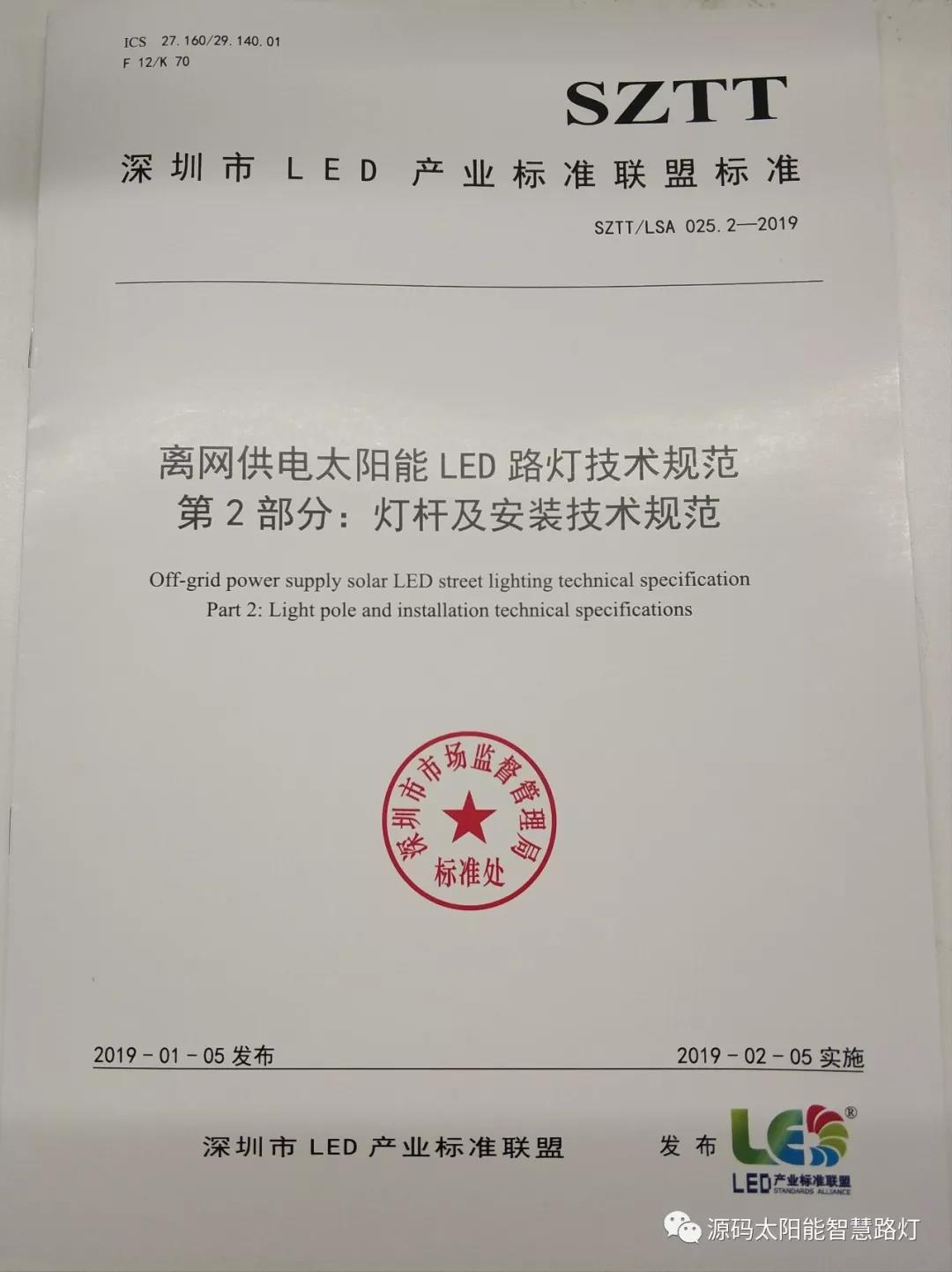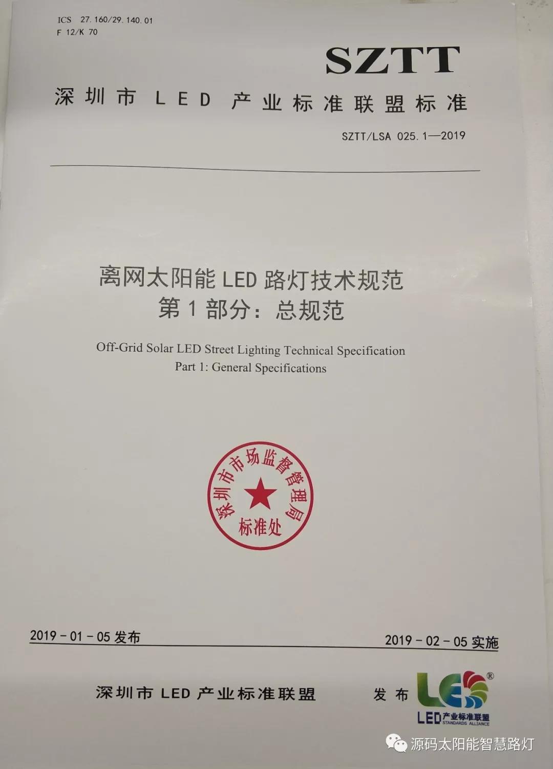 2019年1月5日,深圳市LED產業標準聯盟首次正式對外發布了《離網太陽能LED路燈技術規范》聯盟標準?!峨x網太陽能LED路燈技術規范》聯盟標準包含SZTT/LSA 025.1-2019《總規范》和SZTT/LSA 025.2-2019《燈桿及安裝技術規范》兩部分,主要由深圳源創智能照明有限公司、深圳市計量質量檢測研究院、深圳清華大學研究院、深圳市標準技術研究院、國家半導體光源產品質量監督檢驗中心、廣東省南粵質量技術研究院等共同起草。